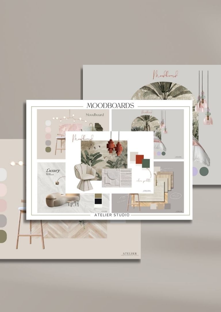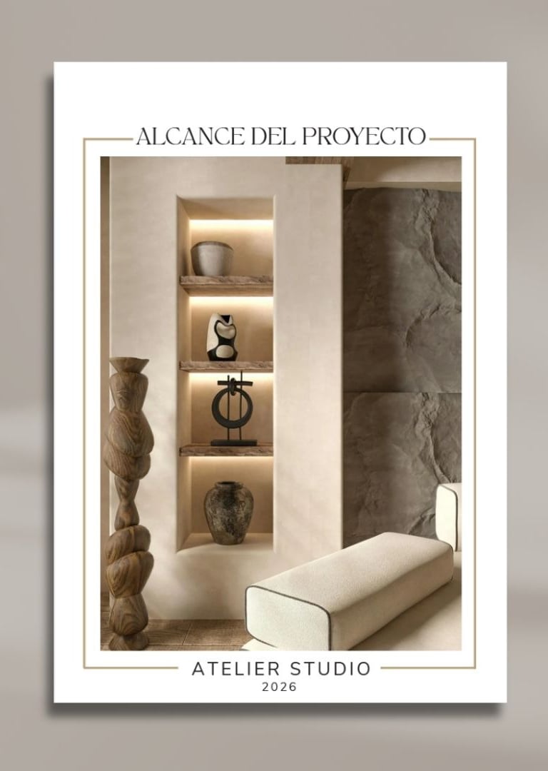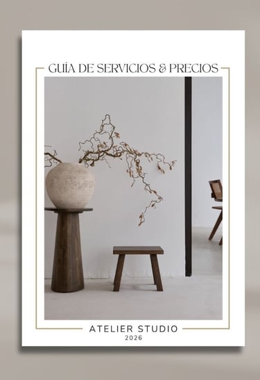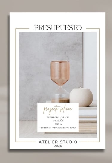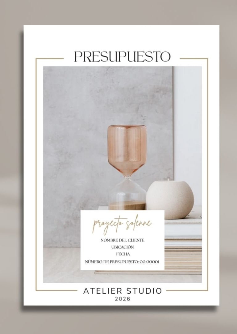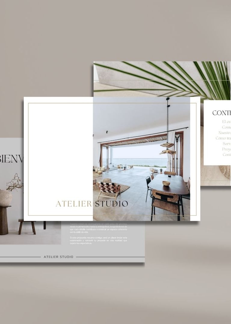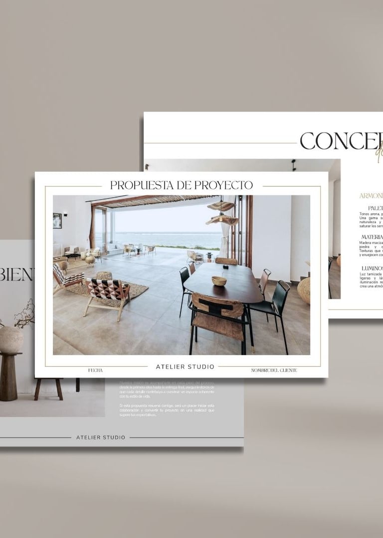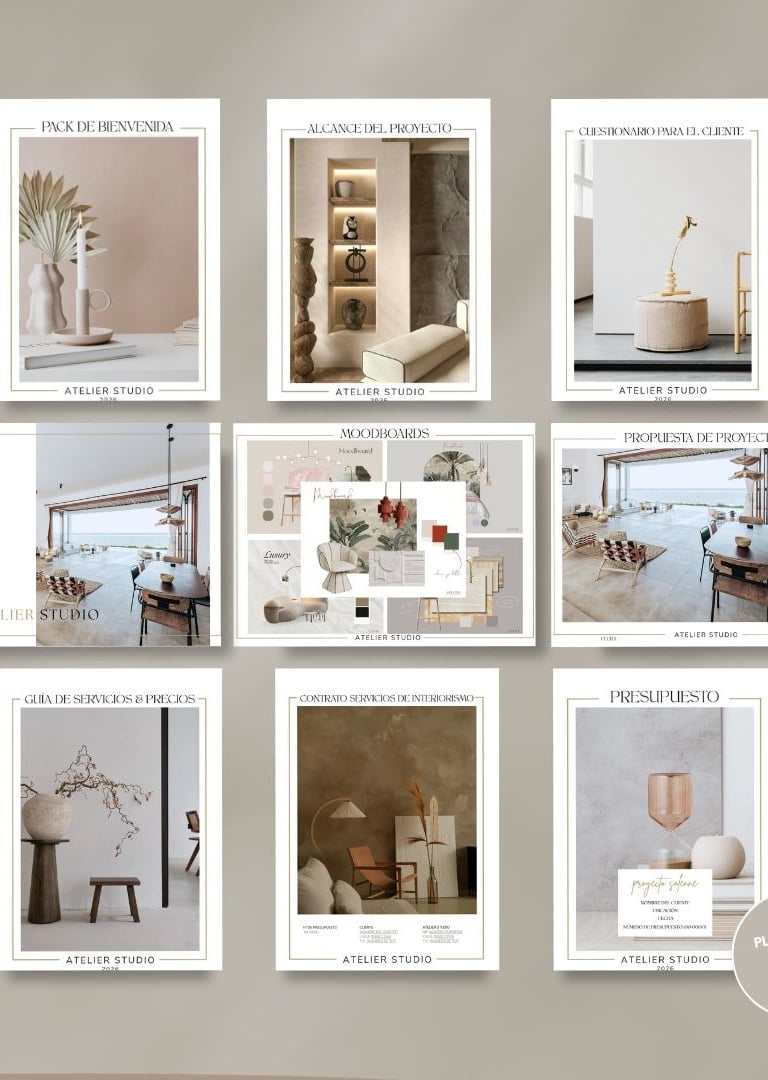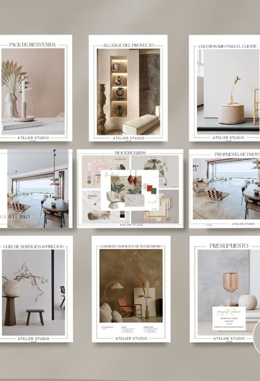 Incluye todas las plantillas editoriales profesionales de Atelier Templates para interioristas y arquitectas, diseñadas para cubrir cada fase del proyecto, desde la propuesta inicial hasta la documentación final.