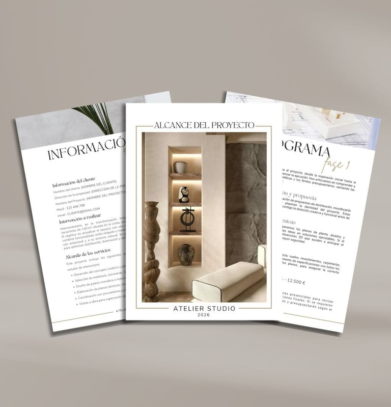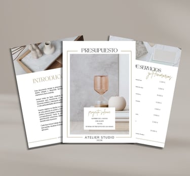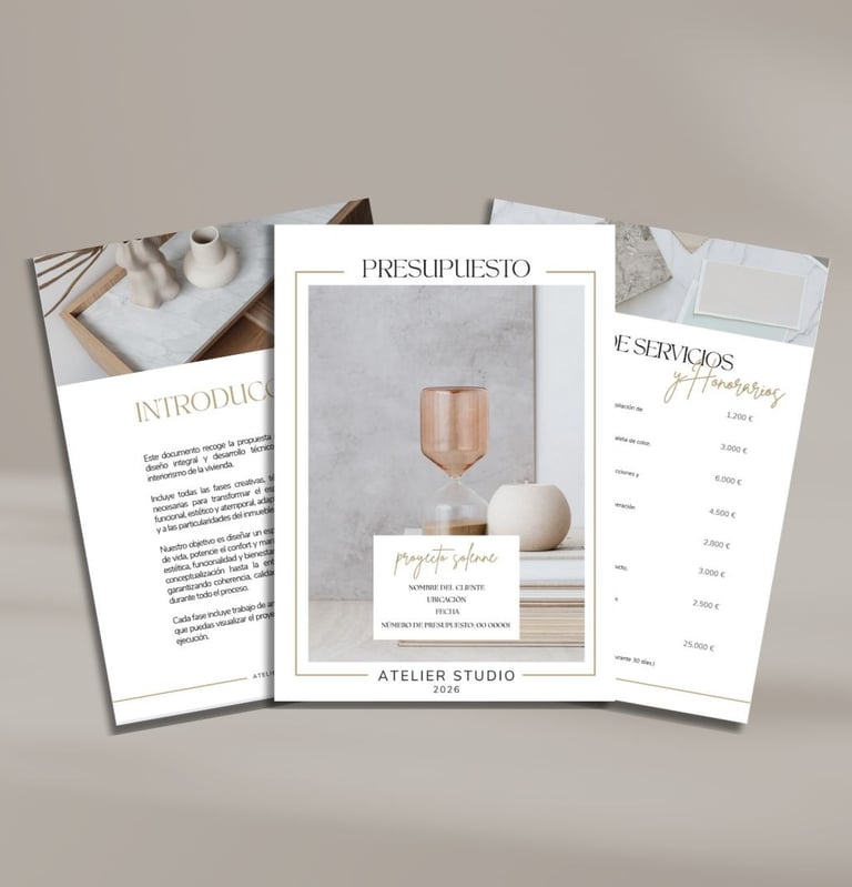 Documentos editables listos para presentar propuestas, presupuestos, contratos y materiales de proyecto con claridad y estética editorial.