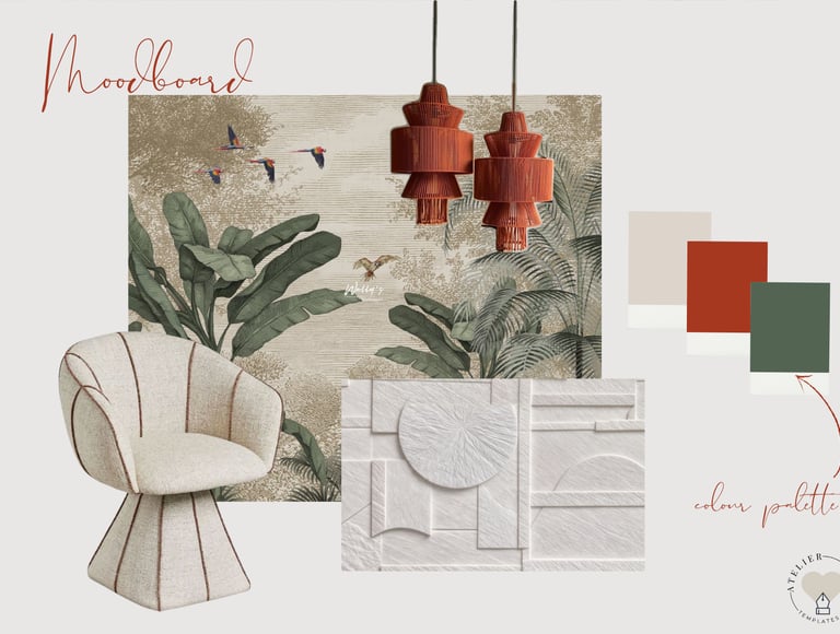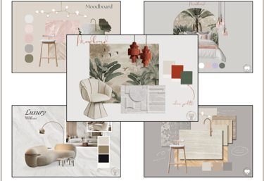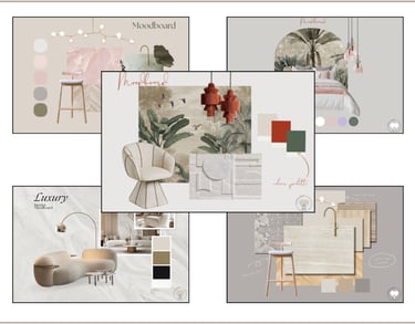 Un pack de 5 moodboards diseñados para interioristas y estudios que desean mostrar estilo, materiales y paletas de color con claridad y coherencia visual desde el primer contacto.
