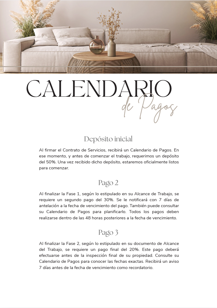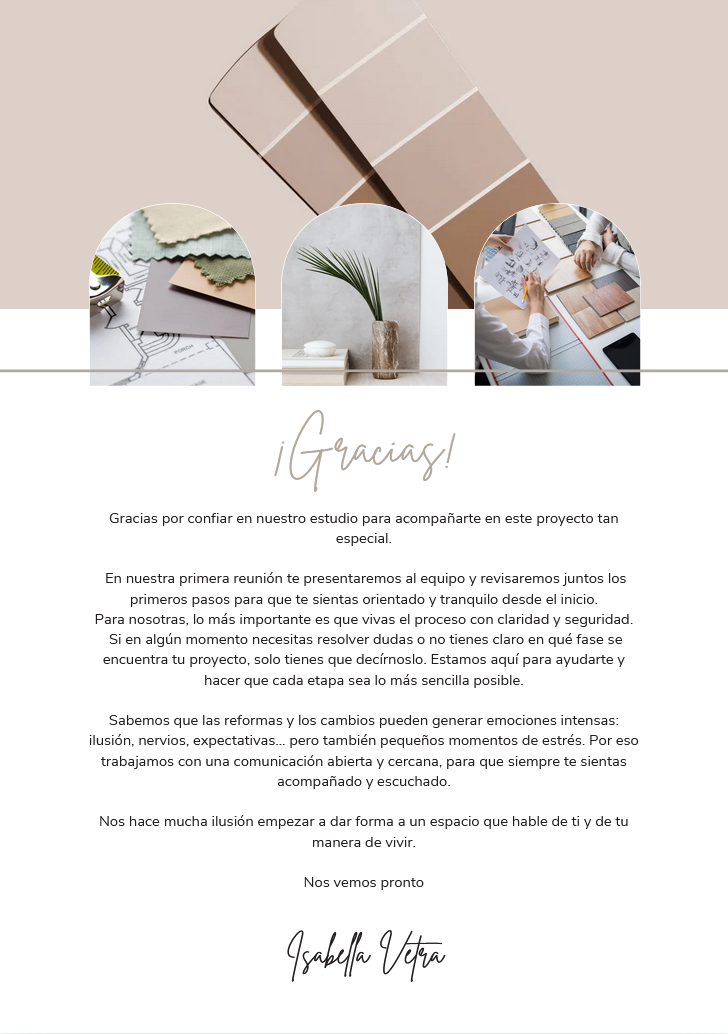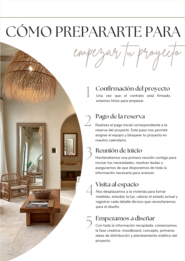 La plantilla profesional que utilizan los estudios de interiorismo para acompañar a sus clientes desde el primer día.