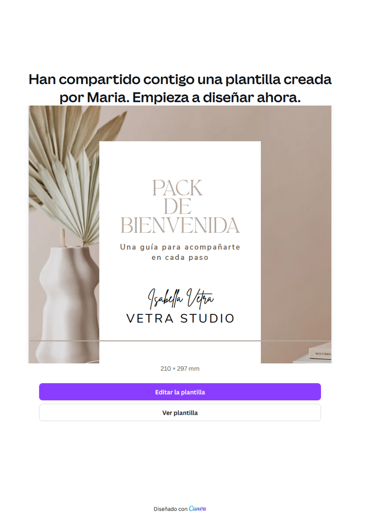 Cuando completes tu compra recibirás un PDF con un enlace directo a Canva: solo tendrás que hacer clic y pulsar “Usar plantilla”. Canva creará una copia automáticamente en tu cuenta (tanto gratuita como Pro), y ya podrás editar textos, imágenes, tipografías o colores con total libertad.